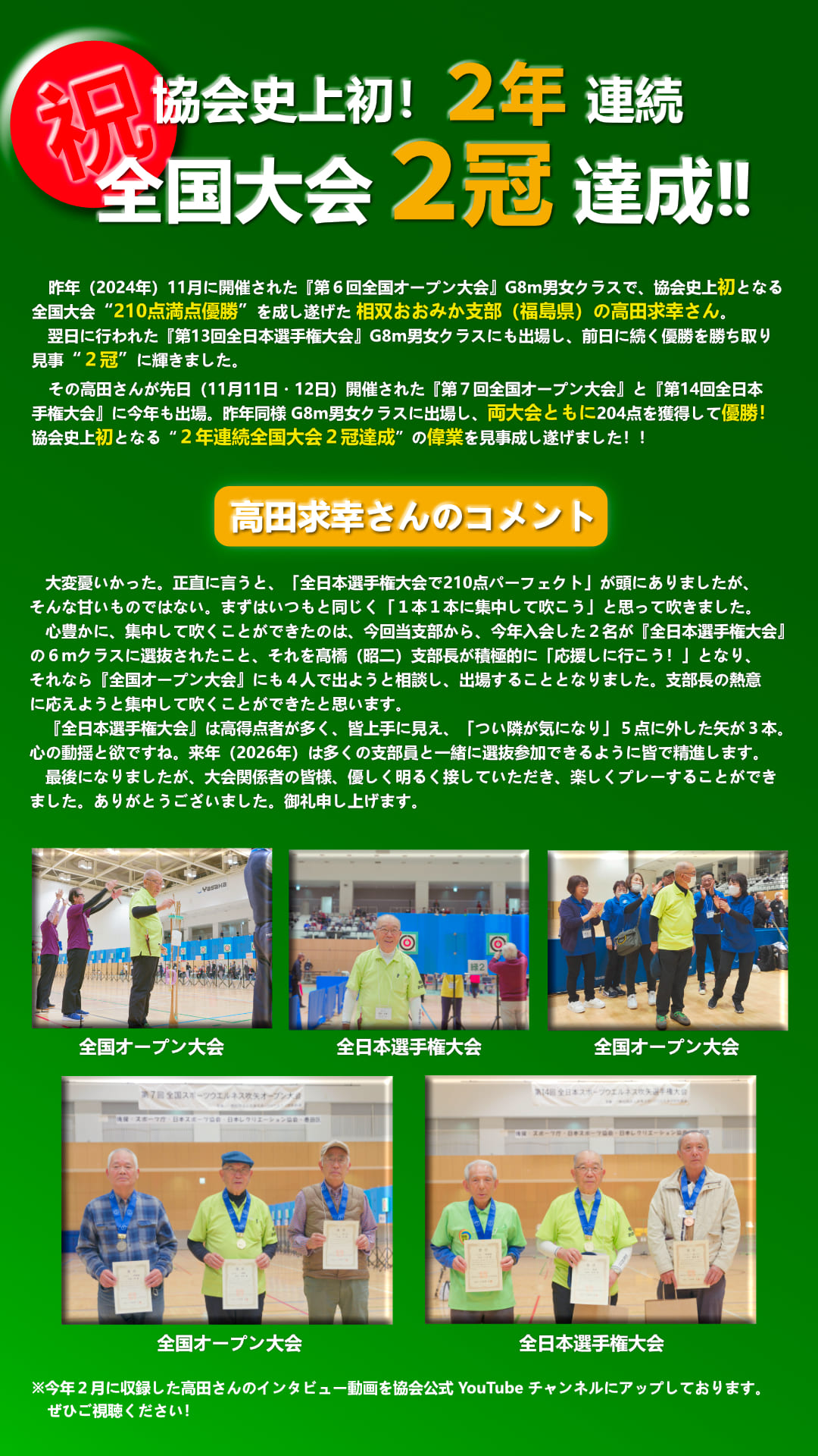 協会史上初! 高田求幸さん(相双おおみか支部/福島県)が全国大会2年連続“2冠”達成!